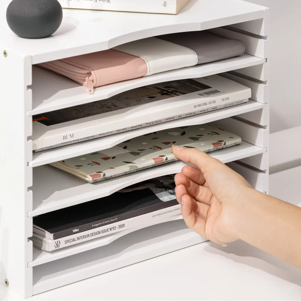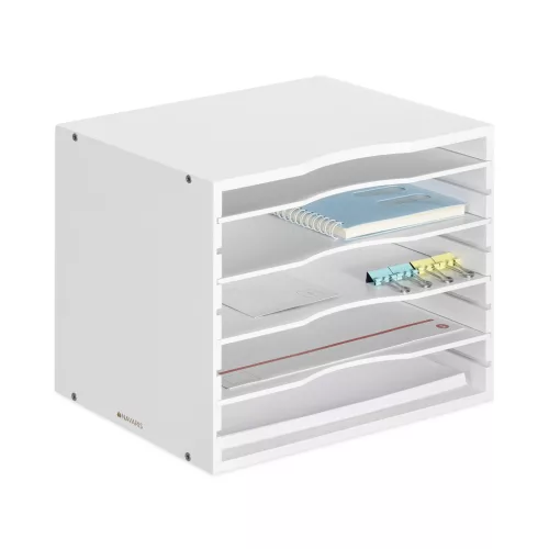 Organizator documente Navaris, 33x24.5x26 cm, rafturi reglabile, birou, alb, MDF/bambus