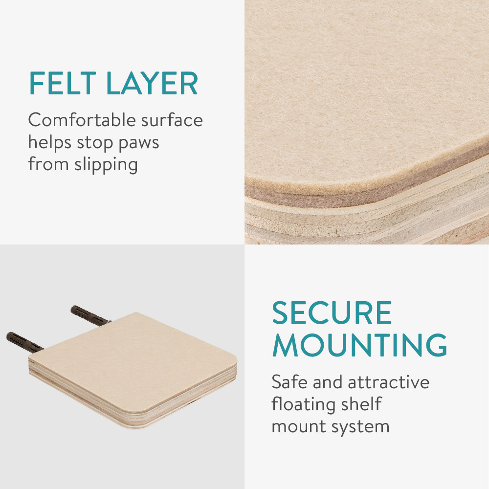 A polcok kiváló minőségű fából készült, filccel borítva, hogy megakadályozza a csúszást és védi a macska mancsait.