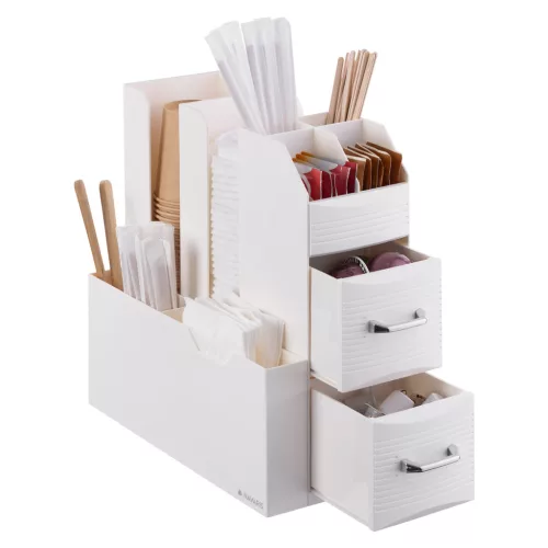 Organizator accesorii cafea Navaris, cu sertare, 31.5x13.7x28.7 cm, alb, plastic