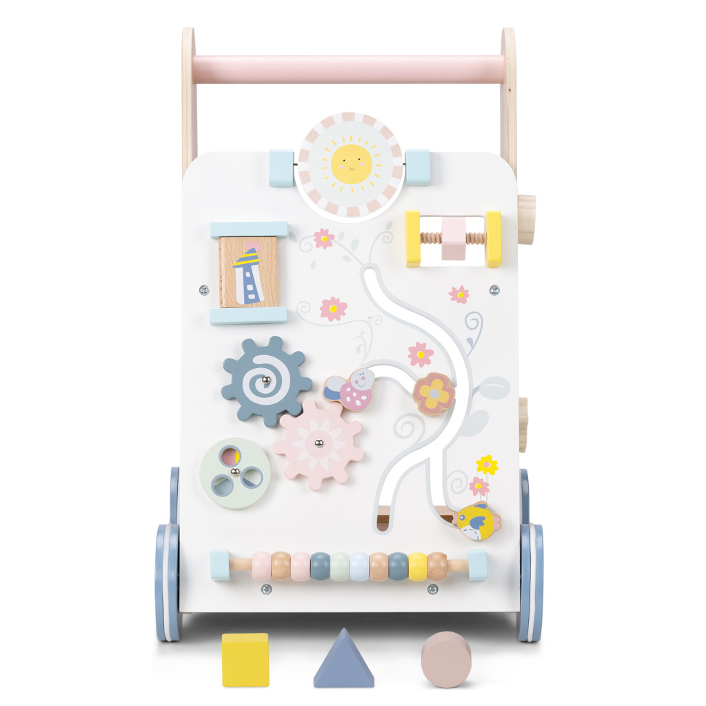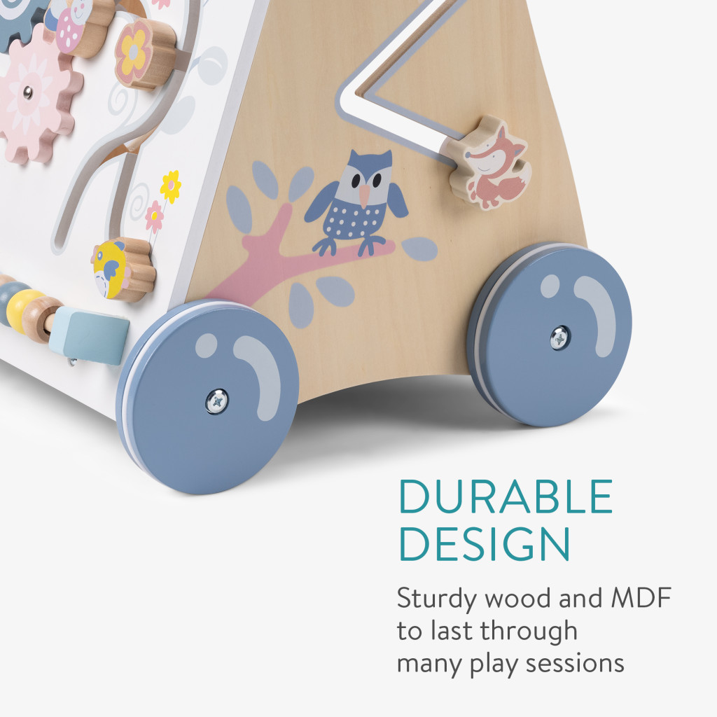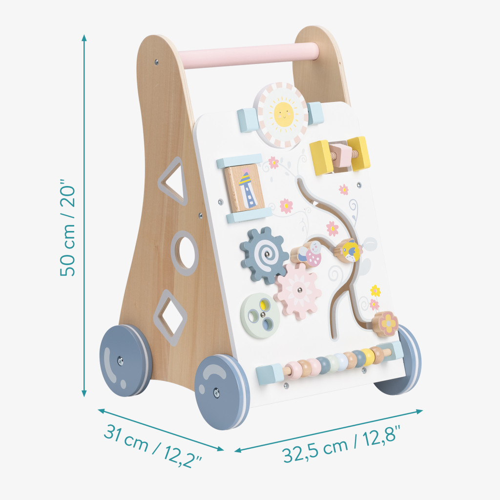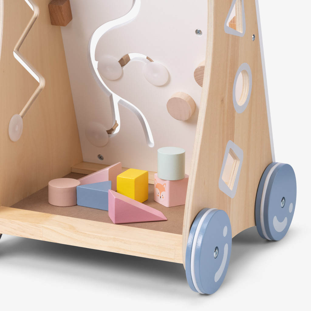 Mersulet din lemn Navaris, centru activitati, compartiment depozitare, roti cauciuc, bej, cauciuc/lemn