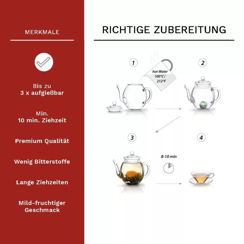 A szép nyíláshoz forrald fel a vizet, és azonnal öntsd üvegedénybe. Óvatosan add hozzá a teagömböt, és figyeld a folyamatot. Az áztatási idő általában néhány perc, és sok változatnál 2-3 egymást követő felöntés is készíthető, eltérő intenzitással. Az íz és az élelmiszerbiztonság érdekében használj frissen forralt vizet, és tartsd be az ajánlott áztatási időt.