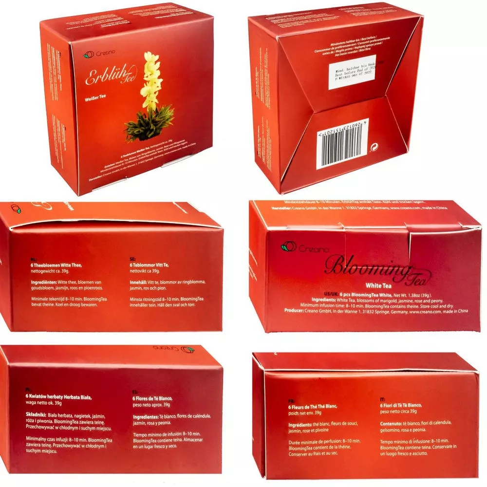 A Creano ErbluhTee virágzó tea kóstolószett megfelelő választás, ha olyan tea-rituálét szeretnél, amely különösebb erőfeszítés nélkül is lenyűgöz. Minden fehér teagömbbe egzotikus virág van beépítve, és amikor forrásban lévő vízzel érintkezik, fokozatosan kinyílik, amíg a virág felemelkedik és formát ölt. Az eredmény finom tea diszkrét virágos jegyekkel és olyan megjelenéssel, amely magára vonja a tekintetet.